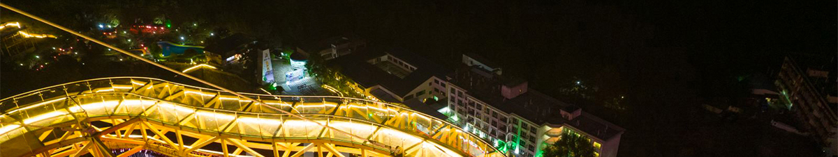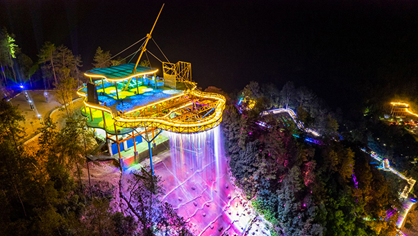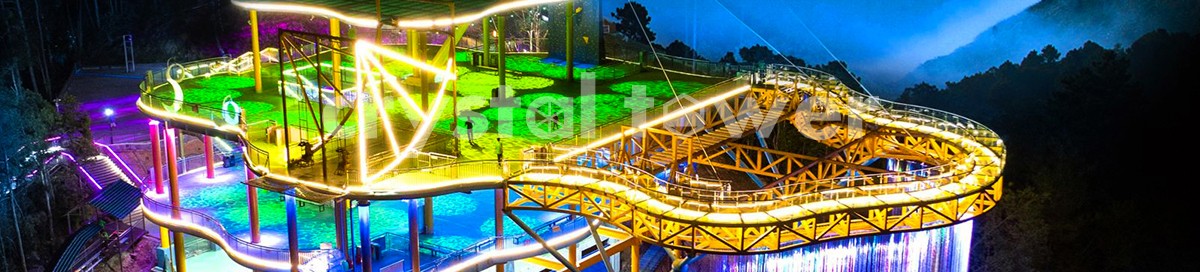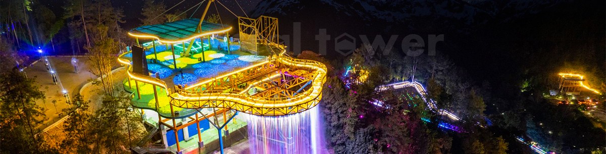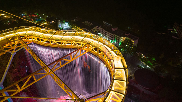 云綜水晶塔總投資 2000 萬元,一層面積 530m2,二層面積 1164m2,三層面積1320m2,總面積約 3000m2,垂直高度約 108m(近 33 層樓高),建在險峻的山體上,共由 21 根巨型鋼柱懸空支撐。獨特的“云”形空中廊橋由平臺向外伸出近 35 米,望去宛如一朵超大的“云”漂浮在高山之上。