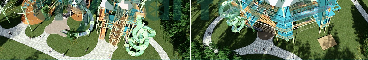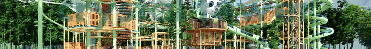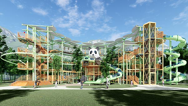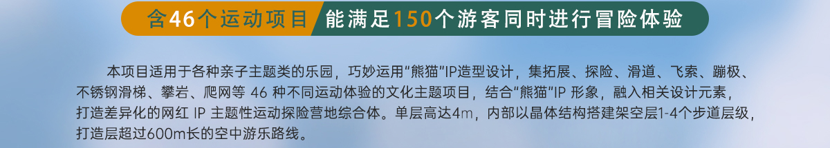 本項目適用于各種親子主題類的樂園,巧妙運(yùn)用“熊貓”IP造型設(shè)計,集拓展、探險、滑道、飛索、蹦極、不銹鋼滑梯、攀巖、爬網(wǎng)等 46 種不同運(yùn)動體驗的文化主題項目,結(jié)合“熊貓”IP 形象,融入相關(guān)設(shè)計元素,打造差異化的網(wǎng)紅 IP 主題性運(yùn)動探險營地綜合體。