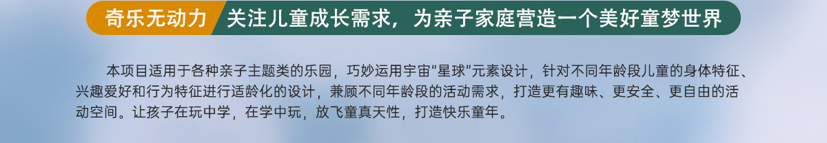 本項(xiàng)目適用于各種親子主題類的樂園,巧妙運(yùn)用宇宙“星球”元素設(shè)計(jì),針對(duì)不同年齡段兒童的身體特征、興趣愛好和行為特征進(jìn)行適齡化的設(shè)計(jì),兼顧不同年齡段的活動(dòng)需求,打造更有趣味、更安全、更自由的活動(dòng)空間。讓孩子在玩中學(xué),在學(xué)中玩,放飛童真天性,打造快樂童年。