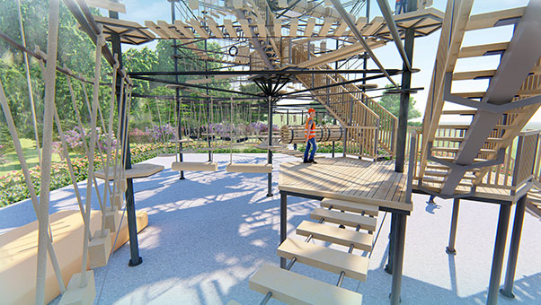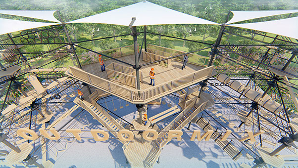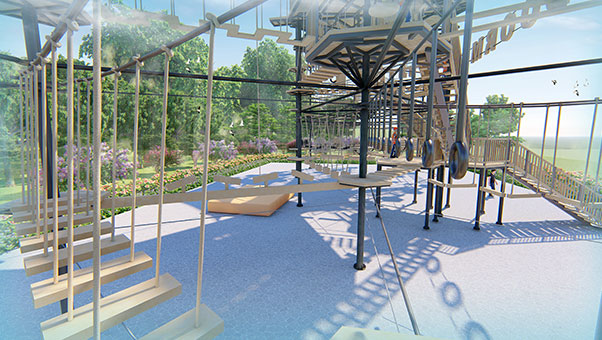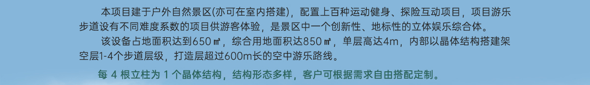 本項(xiàng)目建于戶外自然景區(qū)(亦可在室內(nèi)搭建),配置上百種運(yùn)動(dòng)健身、探險(xiǎn)互動(dòng)項(xiàng)目,項(xiàng)目游樂(lè)步道設(shè)有不同難度系數(shù)的項(xiàng)目供游客體驗(yàn),是景區(qū)中一個(gè)創(chuàng)新性、地標(biāo)性的立體娛樂(lè)綜合體。該設(shè)備占地面積達(dá)到650㎡,綜合用地面積達(dá)850㎡,單層高達(dá)4m,內(nèi)部以晶體結(jié)構(gòu)搭建架空層1-4個(gè)步道層級(jí),打造層超過(guò)600m長(zhǎng)的空中游樂(lè)路線。