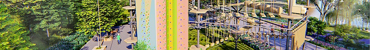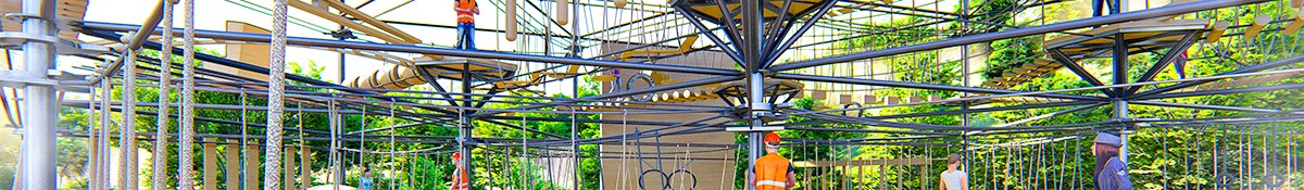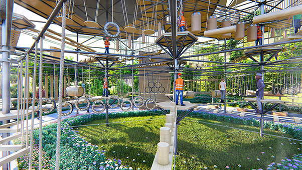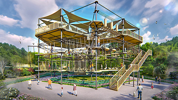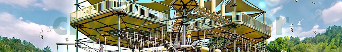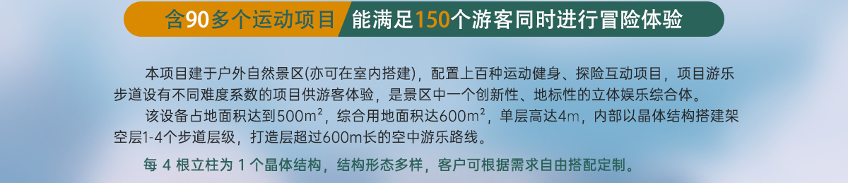 本項目建于戶外自然景區(qū)(亦可在室內(nèi)搭建),配置上百種運(yùn)動健身、探險互動項目,項目游樂步道設(shè)有不同難度系數(shù)的項目供游客體驗,是景區(qū)中一個創(chuàng)新性、地標(biāo)性的立體娛樂綜合體。該設(shè)備占地面積達(dá)到500m2,綜合用地面積達(dá)600m2,單層高達(dá)4m,內(nèi)部以晶體結(jié)構(gòu)搭建架空層1-4個步道層級,打造層超過600m長的空中游樂路線。
