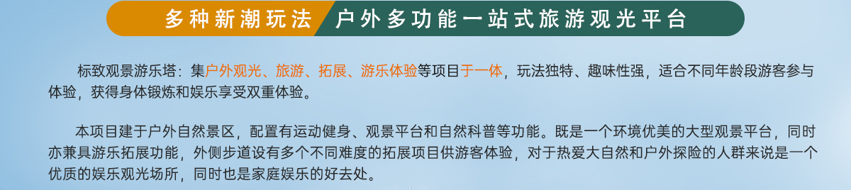 本項目建于戶外自然景區(qū),配置有運(yùn)動健身、觀景平臺和自然科普等功能。既是一個環(huán)境優(yōu)美的大型觀景平臺,同時亦兼具游樂拓展功能,外側(cè)步道設(shè)有多個不同難度的拓展項目供游客體驗(yàn),對于熱愛大自然和戶外探險的人群來說是一個優(yōu)質(zhì)的娛樂觀光場所,同時也是家庭娛樂的好去處。