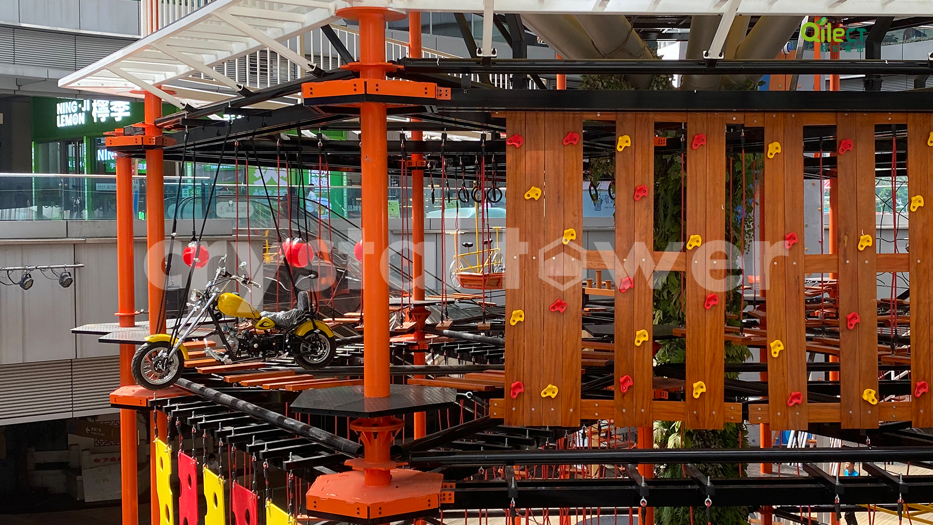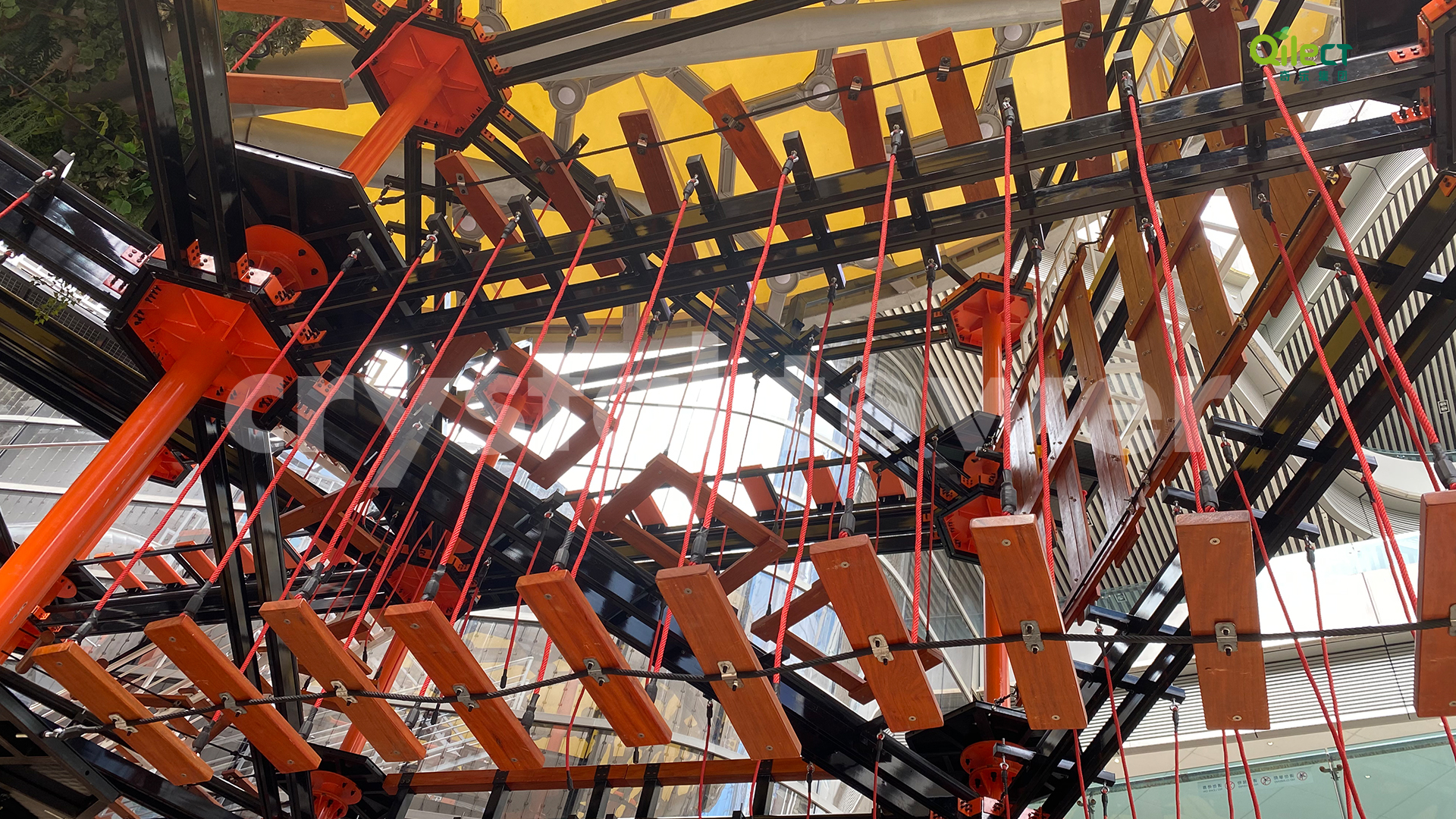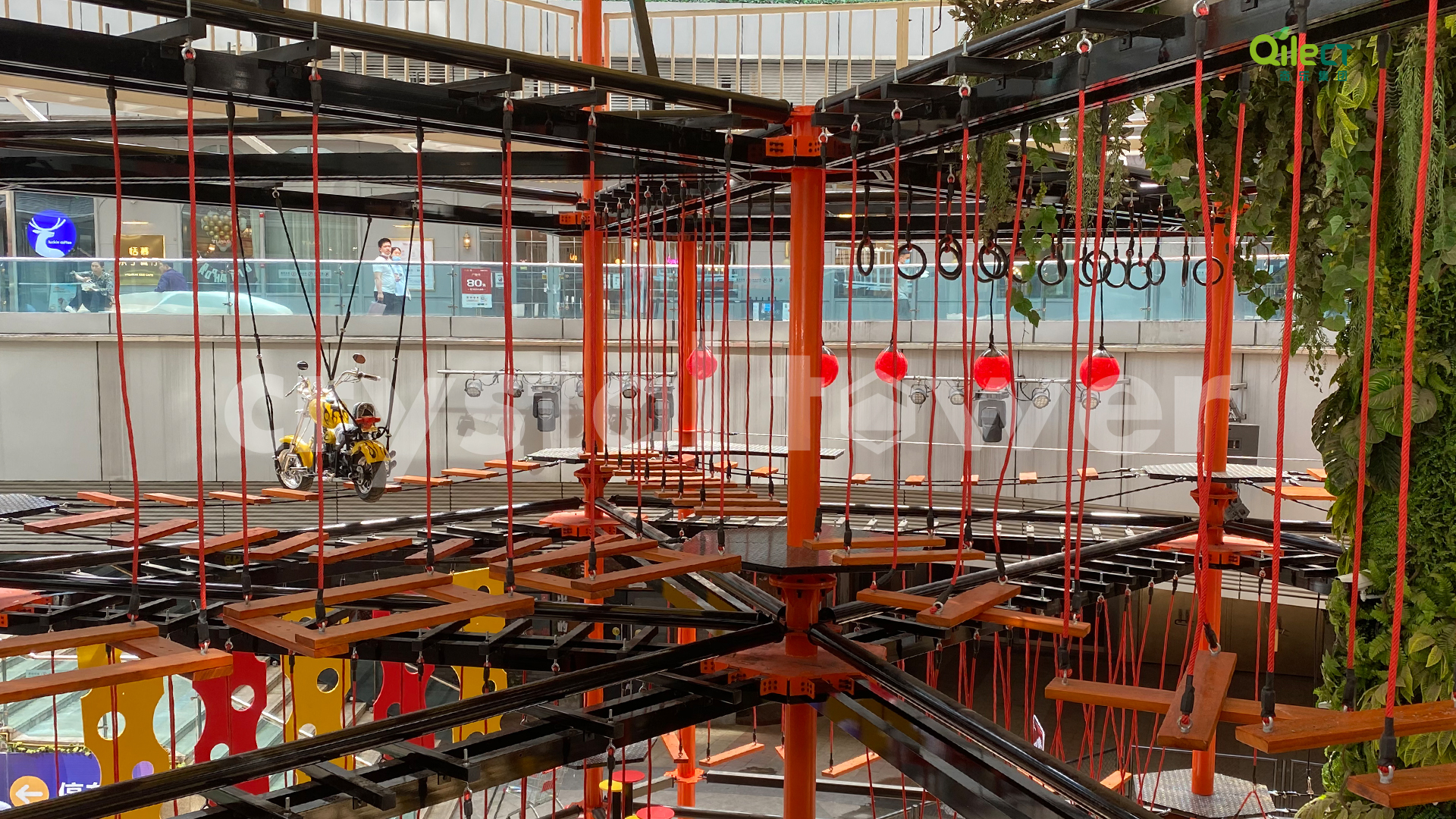設(shè)備占地面積達(dá)到 180m2,綜合用地面積達(dá) 240m2,單層高達(dá) 3m,總高達(dá) 14m,內(nèi)部以晶體結(jié)構(gòu)搭建架空層 1-3 個步道層級,打造超過380m 長的空中游樂路線,其中包含 66 個運動項目(包含尖叫滑梯、低空蹦極、溜索),能滿足 70 個游客同時進(jìn)行冒險體驗。