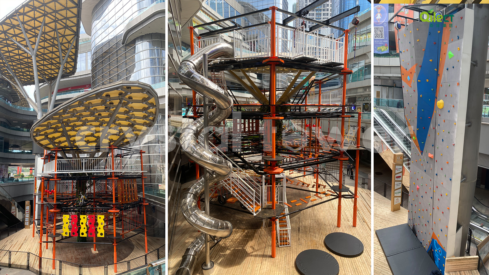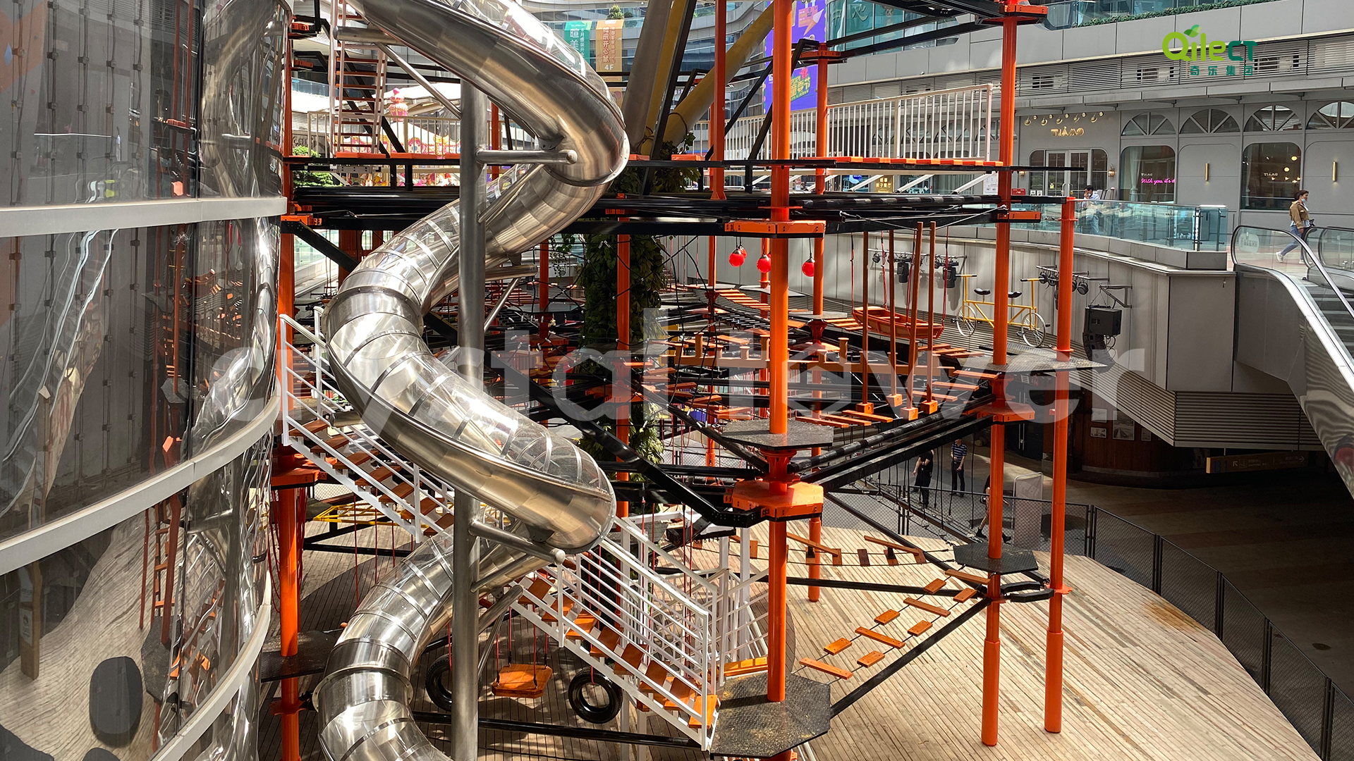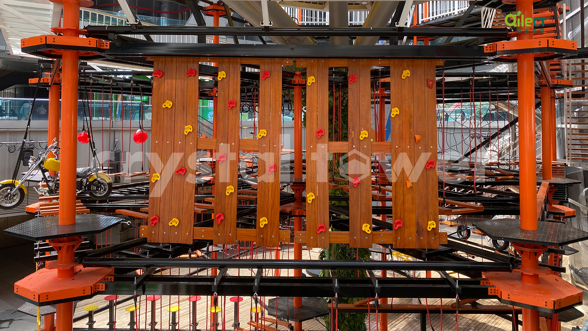 設(shè)備占地面積達(dá)到 180m2,綜合用地面積達(dá) 240m2,單層高達(dá) 3m,總高達(dá) 14m,內(nèi)部以晶體結(jié)構(gòu)搭建架空層 1-3 個步道層級,打造超過380m 長的空中游樂路線,其中包含 66 個運動項目(包含尖叫滑梯、低空蹦極、溜索),能滿足 70 個游客同時進(jìn)行冒險體驗。