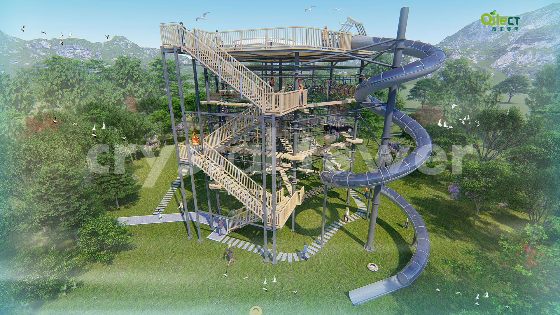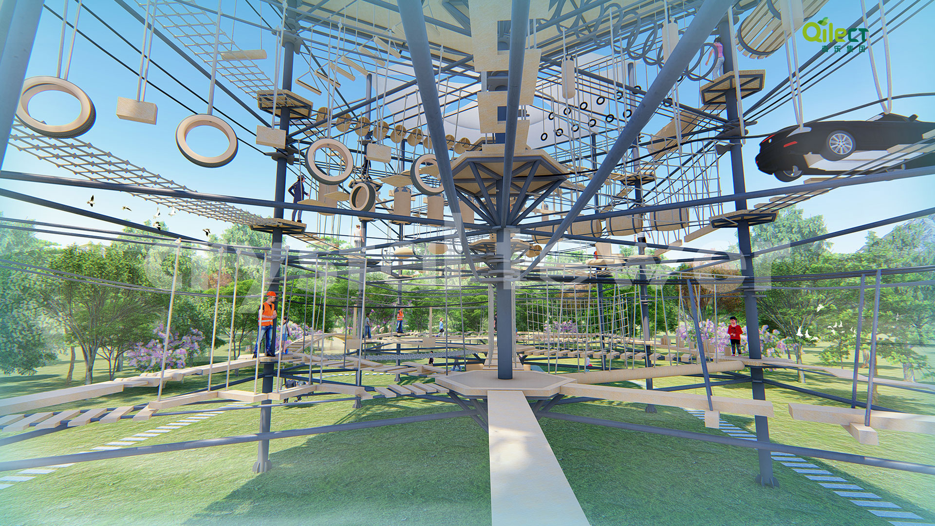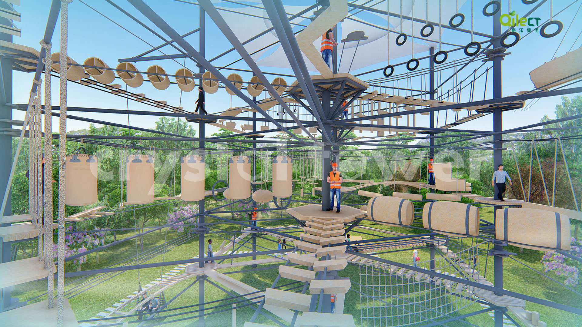 本項(xiàng)目建于戶(hù)外自然景區(qū)(亦可在室內(nèi)搭建),配置上百種運(yùn)動(dòng)健身、探險(xiǎn)互動(dòng)項(xiàng)目,項(xiàng)目游樂(lè)步道設(shè)有不同難度系數(shù)的項(xiàng)目供游客體驗(yàn),是景區(qū)中一個(gè)創(chuàng)新性、地標(biāo)性的立體娛樂(lè)綜合體。該設(shè)備占地面積達(dá)到800㎡,綜合用地面積達(dá)1000㎡,單層高達(dá)4m,內(nèi)部以晶體結(jié)構(gòu)搭建架空層1-4個(gè)步道層級(jí),打造層超過(guò)1m長(zhǎng)的空中游樂(lè)路線。