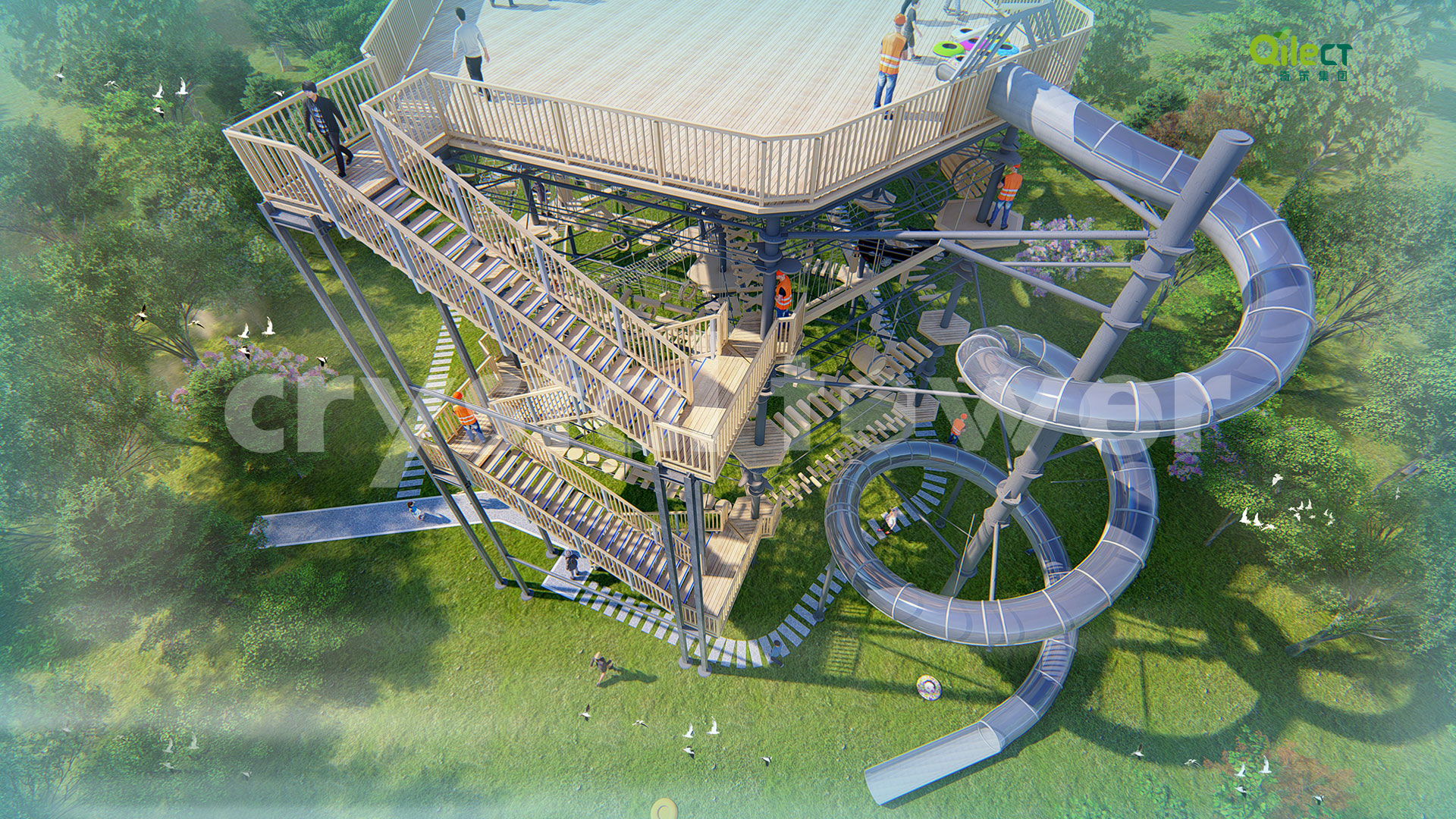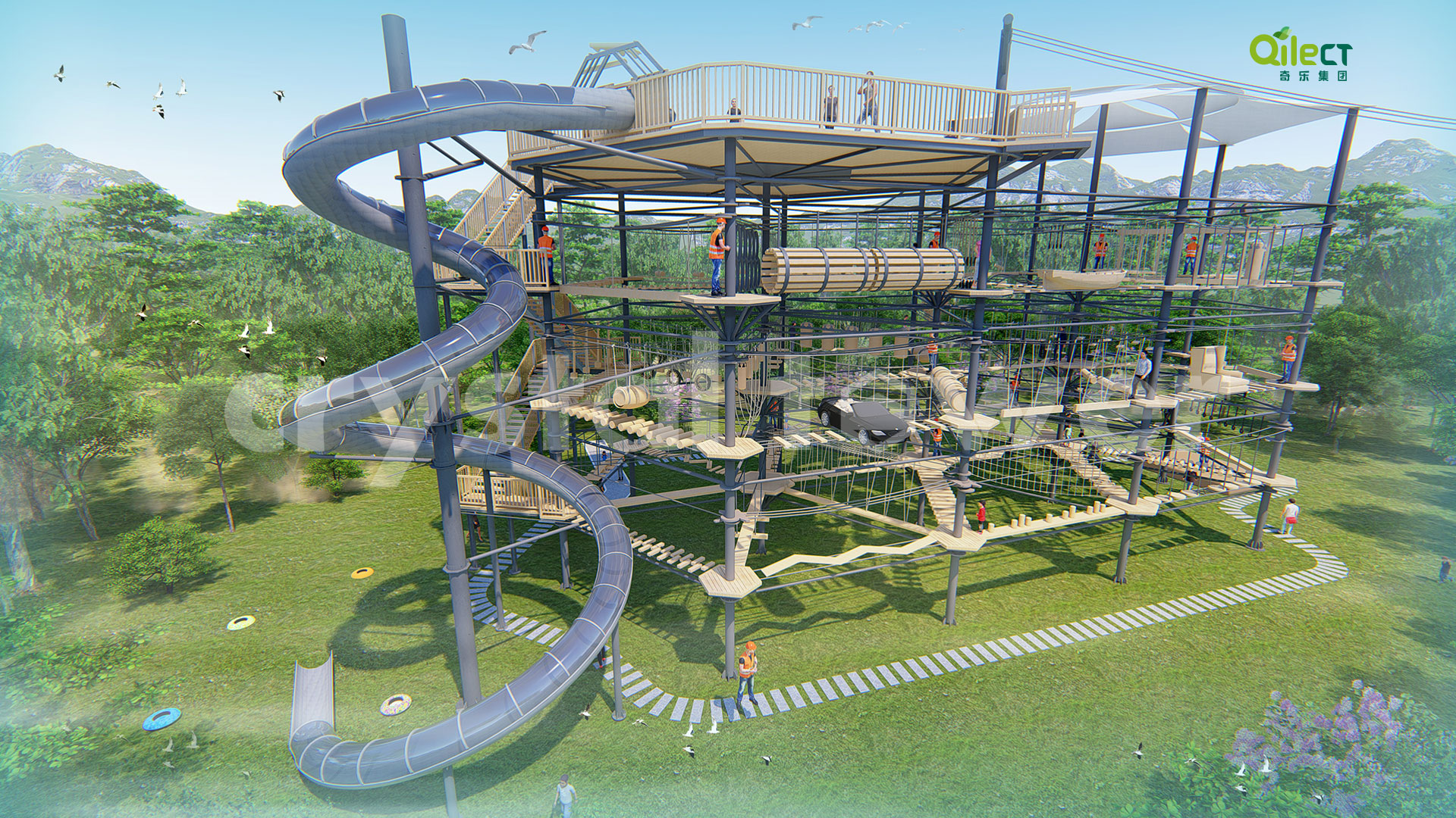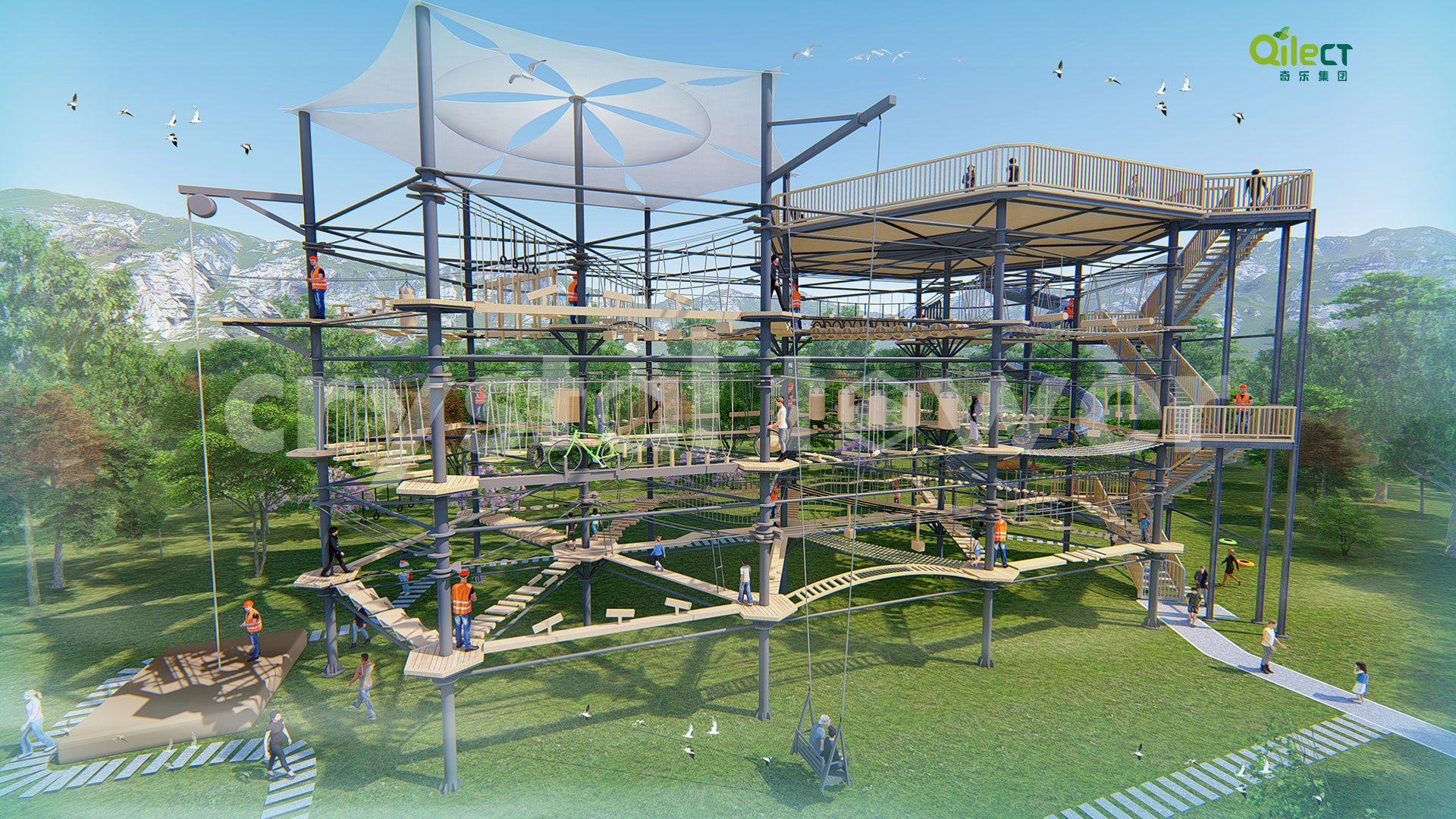 本項(xiàng)目建于戶(hù)外自然景區(qū)(亦可在室內(nèi)搭建),配置上百種運(yùn)動(dòng)健身、探險(xiǎn)互動(dòng)項(xiàng)目,項(xiàng)目游樂(lè)步道設(shè)有不同難度系數(shù)的項(xiàng)目供游客體驗(yàn),是景區(qū)中一個(gè)創(chuàng)新性、地標(biāo)性的立體娛樂(lè)綜合體。該設(shè)備占地面積達(dá)到800㎡,綜合用地面積達(dá)1000㎡,單層高達(dá)4m,內(nèi)部以晶體結(jié)構(gòu)搭建架空層1-4個(gè)步道層級(jí),打造層超過(guò)1m長(zhǎng)的空中游樂(lè)路線。