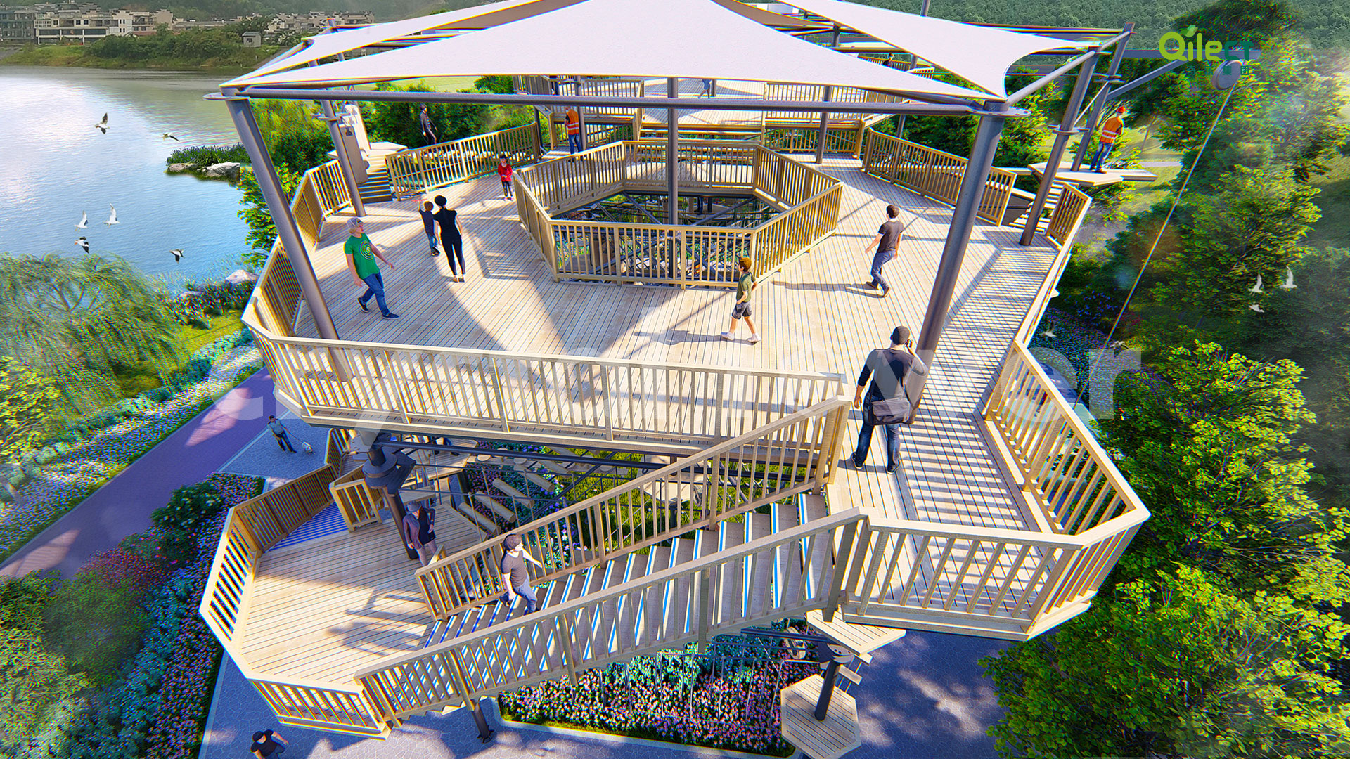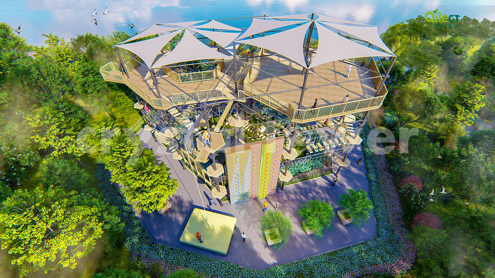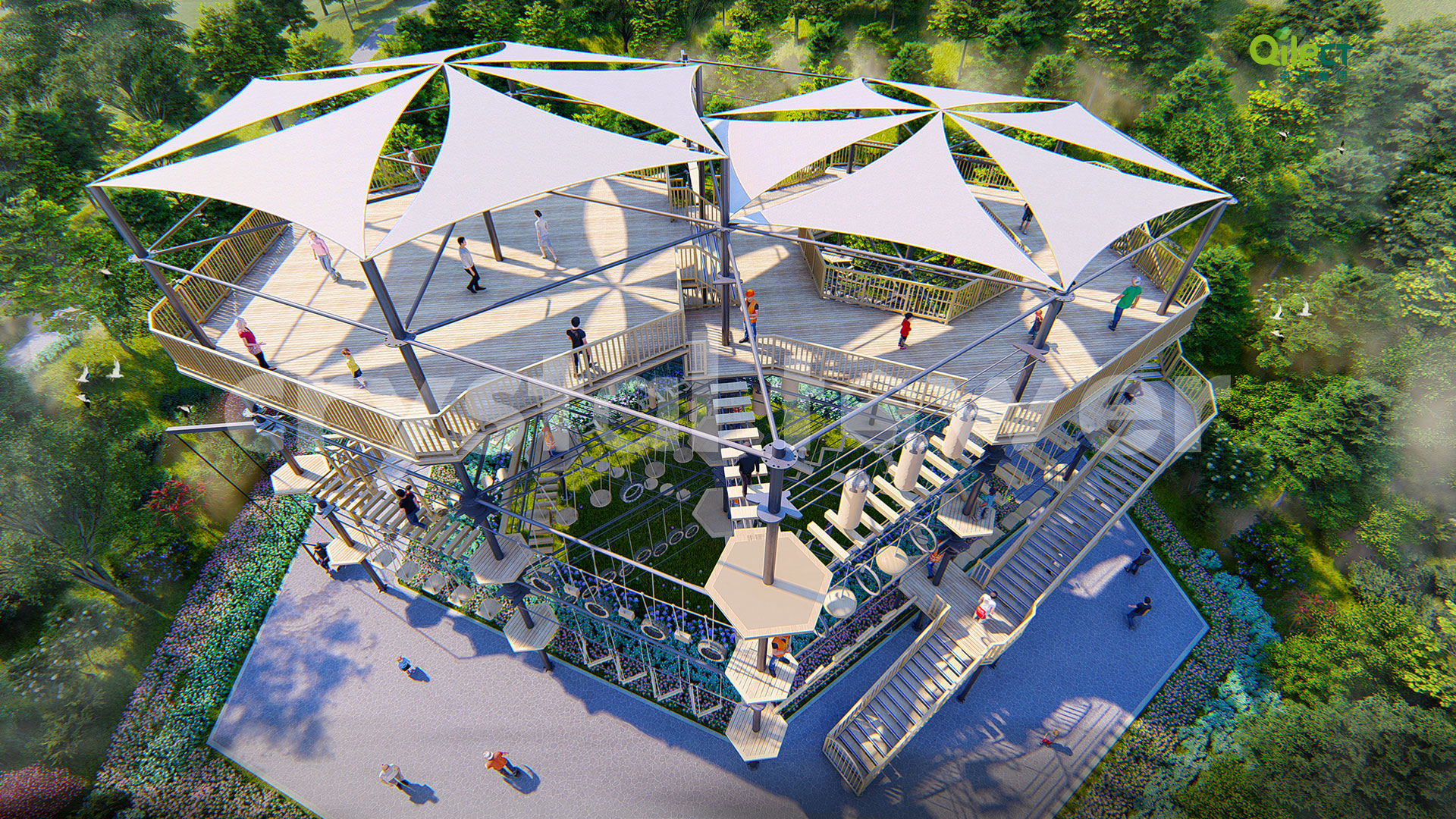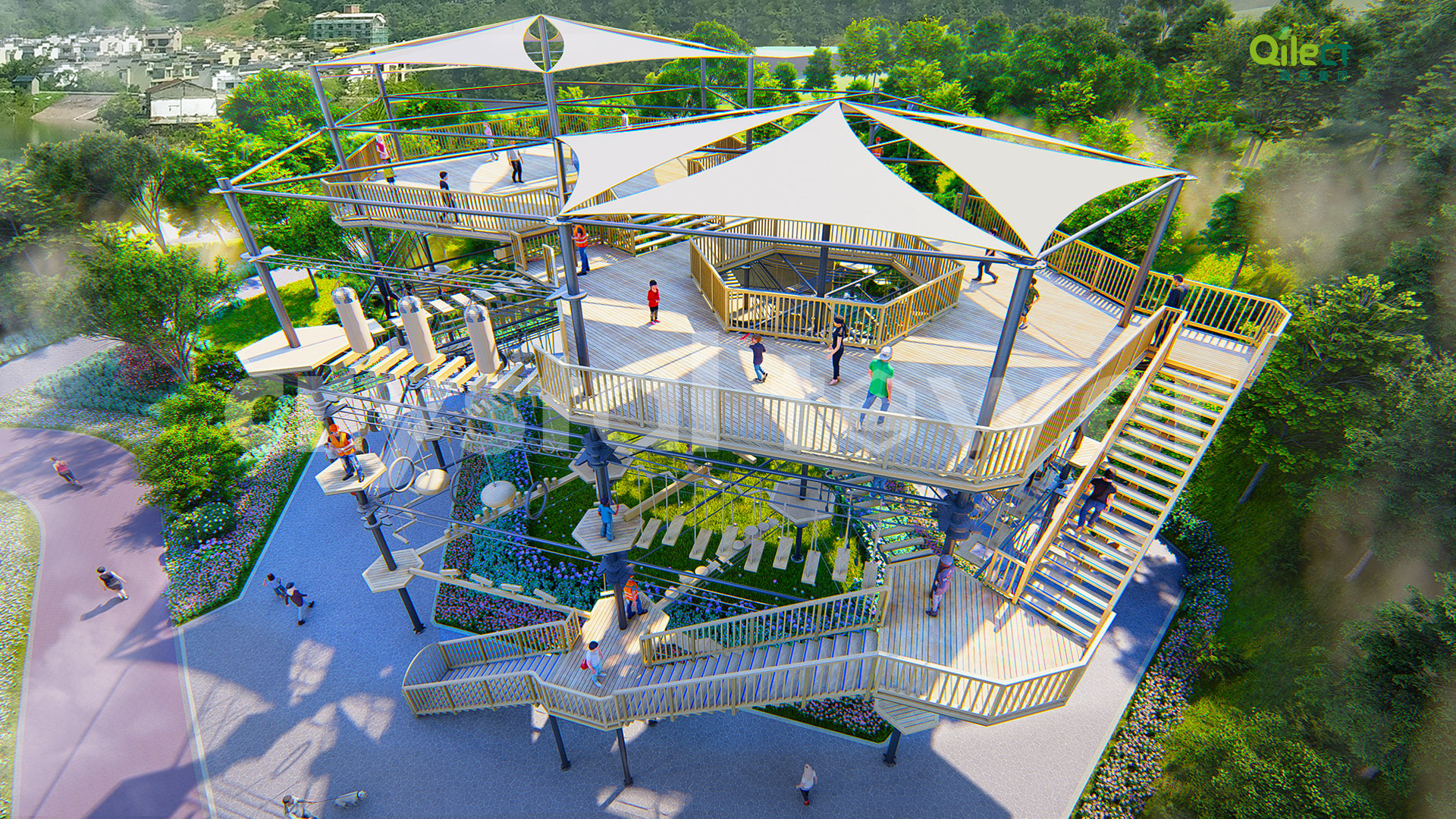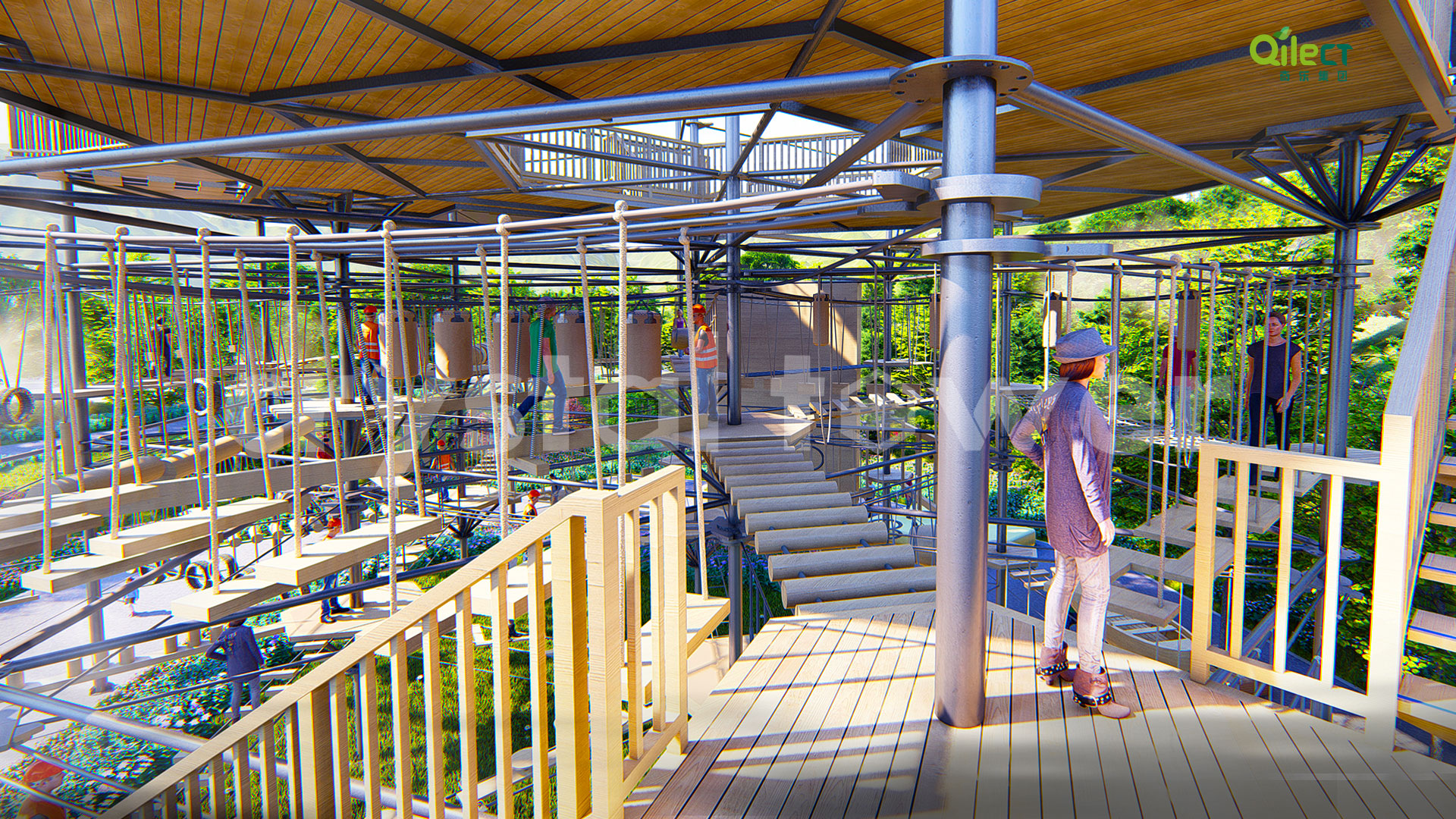 本項目建于戶外自然景區(qū)(亦可在室內(nèi)搭建),配置上百種運動健身、探險互動項目,項目游樂步道設有不同難度系數(shù)的項目供游客體驗,是景區(qū)中一個創(chuàng)新性、地標性的立體娛樂綜合體。該設備占地面積達到500m2,綜合用地面積達600m2,單層高達4m,內(nèi)部以晶體結構搭建架空層1-4個步道層級,打造層超過600m長的空中游樂路線。
